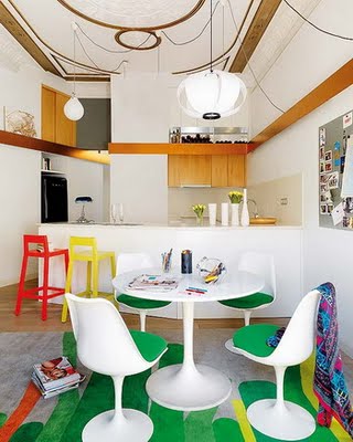 - Una cocina comedor blanca donde los colores vivos llegan formando parte de los detalles. Se han utilizado rojo, verde, amarillo y turquesa.